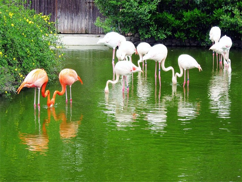 火烈鳥展區位于正大門口,共展出88只火烈鳥,有迎賓小姐的美稱,紅色的是美洲火烈鳥,粉紅色的是歐洲火烈鳥。它們有“Z”字形的長頸和鐮刀形的長嘴。此外它們還有一雙蜘蛛般的長腿,顏色發紅。它們有著獨特的淡朱紅色的羽毛。遠遠看去宛如一團火球。所以又有“火鶴”之稱更奇特的是無論它們的羽毛如何美麗,一經拔下就變成白色。它們的嘴和眼也生的與眾鳥不同:嘴細長彎曲向下,色多淡紅,基部為黃色,眼睛又細又瘦,與它們那龐大的身軀很不協調。