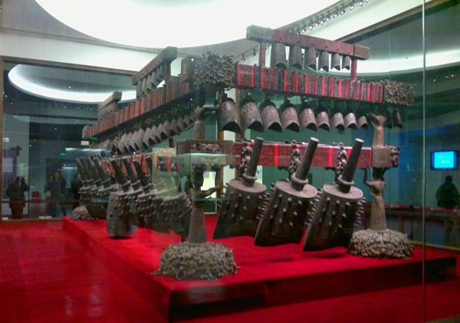 曾侯乙編鐘:時期為戰國時期,1978年湖北隨縣曾侯乙墓出土。鐘架長748厘米,高265厘米,重4.5噸左右。全套編鐘共六十五件,分三層,八組懸掛在呈曲尺形的銅木結構鐘架上。每件鐘均能奏出呈三度音階的雙音,全套鐘十二個半音齊奏,可以旋宮轉調。音階為現今通用的C大調,能演奏五聲、六聲或七聲音階樂曲。