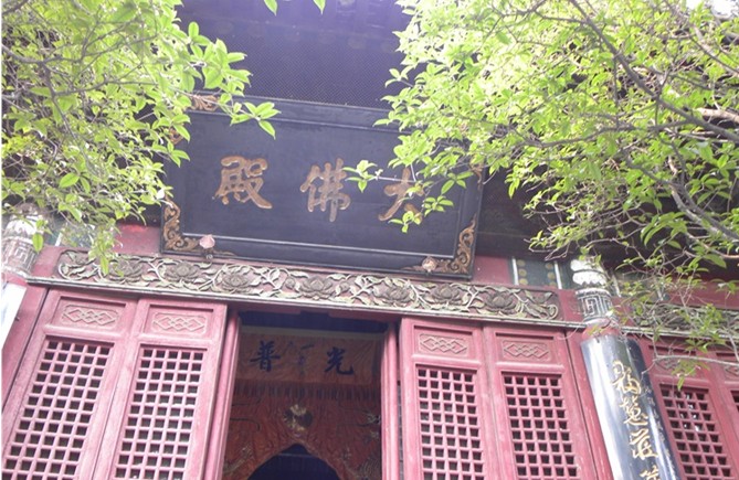 大佛殿之后,是一座懸山式建筑“大雄殿”。它長22.8米,寬14.2米。殿前有一月臺(tái),是寺院內(nèi)最大的殿宇。由歇山頂改為懸山頂,面積有所縮小。殿內(nèi)貼金雕花的大佛龕內(nèi)塑的是三世佛:中為婆娑世界的釋迦牟尼佛,左為東方凈琉璃世界的藥師佛,右為西方極樂世界的阿彌陀佛。三尊佛像前,站著韋馱、韋力兩位護(hù)法天將的塑像,執(zhí)持法器。兩側(cè)排列十八尊神態(tài)各異、眉目俊朗的羅漢塑像。這十八羅漢都是用漆、麻、絲、綢在泥胎上層層裱裹,然后揭出泥胎,制成塑像,這種“脫胎漆”工藝叫夾苧干漆工藝,在國內(nèi)是獨(dú)一無二的,乃寺中塑像之精品,每座佛都是空心的,一只手即可托起。背后殿壁上還排列整齊地刻鏤著五千余尊微型佛像。大雄殿后有接引殿,為一般寺院所罕見。長14米,進(jìn)深10.7米。為雙層殿基,是寺內(nèi)最小建筑。殿內(nèi)供西方三圣。中為阿彌陀佛立像,左邊為持凈瓶的觀世音菩薩,右邊握摩尼寶珠的是大勢至菩薩,均為清代泥塑。