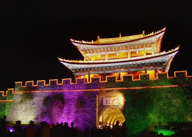 大理古城簡稱葉榆,又稱紫城,其歷史可追溯至唐天寶年間,南詔王閣邏鳳筑的羊苴咩城(今城之西三塔附近),為其新都。現在的古城始建于明洪武十五年(公元1382年),方圓十二里,城墻高二丈五尺,厚二丈。東西南北各設一門,均有城樓,四角還有角樓。解放初,城墻均被拆毀。1982年,重修南城門,門頭“大理”二字是集郭沫若書法而成。 由南城門進城,一條直通北門的復興路,成了繁華的街市,沿街店鋪比肩而設,出售大理石、扎染等民族工藝品及珠寶玉石。街巷間一些老宅,也仍可尋昔日風貌,庭院里花木扶疏,鳥鳴聲聲,戶外溪渠流水淙淙。“三家一眼井,一戶幾盆花”的景象依然。古城內東西走向的護國路,被稱為“洋人街”。這里一家接一家的中西餐館、咖啡館、茶館及工藝品商店,招牌、廣告多用洋文書寫,吸著金發碧眼的“老外”,在這里流連忘返,尋找東方古韻,漸成一道別致的風景。