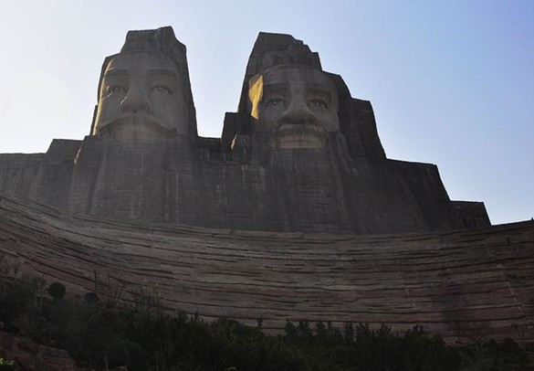 是目前國(guó)內(nèi)最雄偉的雕塑之一。它依山就勢(shì),以山為體,82米高的整座向陽(yáng)山作為像身,再在山頂塑造18米高的頭像,總高達(dá)到100米。構(gòu)思新穎,獨(dú)具匠心,不同凡響。二帝坐南朝北,背依邙山,面對(duì)黃河。巨像前是一個(gè)開(kāi)闊場(chǎng)地,周?chē)橹菜砂兀虚g建筑祭壇。祭壇至塑像的軸線上建有長(zhǎng)200米的神道,兩側(cè)各列四座鑄銅大鼎,連同山前一座共九鼎,寓意九州四方江山永固。廣場(chǎng)東西兩端擺放大型編鐘、銅鼓各一個(gè)。
