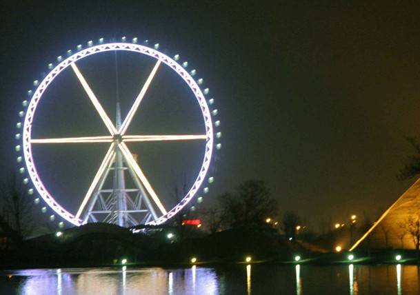世紀歡樂園摩天輪是目前為止中原最高的摩天輪,吊艙有56個,重達數(shù)千噸。在被鄭州市列入夜景照明工程后,近日,鄭州市市政部門投資600多萬元對其進行了精心設計,在該摩天輪上安裝了裝飾燈。該燈由2000多根彩色燈管圍繞直徑90 多米的摩天輪組成,中間的六根菱形支柱也被變幻的燈管裝飾,無論是從高度還是燈管的長度,該燈都堪稱“亞洲第一燈”。在三十多項大型游樂項目中,多項設施曾居亞洲、中國之冠。有高達38米、長達888米全國最長的老金礦過山車,高達120米亞洲最高的摩天輪,更有建在神秘金字塔中,擁有世界最先進技術(shù)、中原首家4D影院。空中飛舞、瘋狂大擺錘、藍色風暴、飛躍亞馬遜、古墓麗影、俠膽豪情、水上騎士、現(xiàn)代阿凡提……應接不暇,樂趣無窮。六大站區(qū)開設反映異域風情、民族文化的歌舞表演、雜耍技藝;開設體現(xiàn)本站區(qū)國家風格、民族特點的風味餐飲食品及工藝品,紀念品;80畝的歡樂湖畔碧波連映、縱情蕩漾,令游客心醉神迷,不亦樂乎。