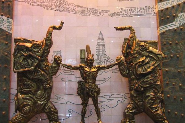 商代 ,37厘米 口徑32厘米大敞口,束頸,折肩,腹弧下內(nèi)收,圜底,高圈足;頸飾三周弦紋,肩部環(huán)飾三個(gè)淺浮雕牛首,皆圓目橫角,立體感強(qiáng);牛首之間飾帶狀夔紋和連珠紋,腹部飾三組獸面紋,獸面紋上下分別界以一周帶狀連珠紋,均技法嚴(yán)謹(jǐn),線條流暢;圈足上飾三周弦紋,間有三個(gè)等距的“十”字形鏤孔。牛首尊1982年出土于鄭州市向陽回族食品廠青銅器窖藏坑。整器造型莊重,紋飾精美,鑄工精良。