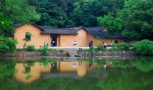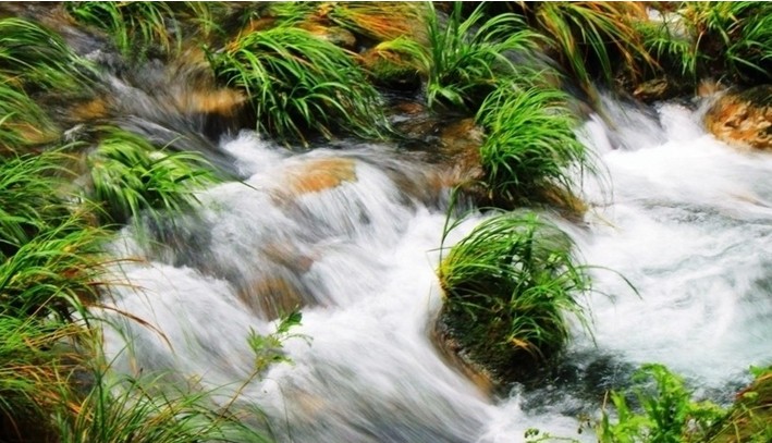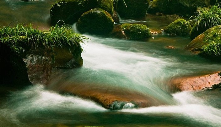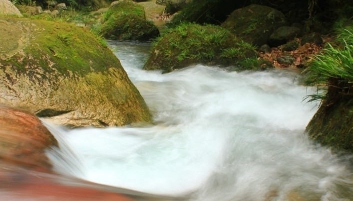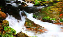 9、紫草潭:位于金鞭溪中游。原名紙草潭,因清代山民造土紙?jiān)诖似鞫L秾?米,長(zhǎng) 15 米,深2米。上連一石潭。潭底皆紫紅色巖石,潭上端溪流湍急,跌宕有聲,水花如滾珠瀉玉。潭內(nèi)水面平靜,清澈見底,魚蝦悠游其中。 游魚細(xì)石,直視無礙,夾岸林林蒼翠,石峰屏列。潭邊巨石橫臥,光潔如玉。