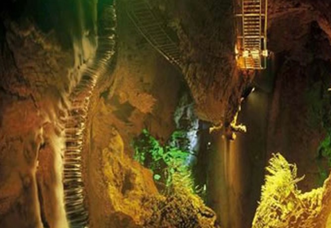 全長4.6公里,亞洲第一地下長河的水溶洞奇觀為景區主要景點。洞內景觀保存完好,清澈見底的地下河終年不絕,水平如鏡。倒影似龍宮、仙境,亦真亦幻,真假難辨;落差達18米的四級地下瀑布構成了雄偉奇麗的瀑布群,形成了洞內“飛流直下三千尺,疑是銀河落九天”的人間絕景;游客可在地下河內漂流,流速時快時慢,讓人既有驚險刺激的感受又可悠閑自如欣賞地下奇觀美景。有張關“三絕”: 版權所有山東聊城聊之旅國際旅行社有限公司,轉載必究!夢幻倒影、銀河飛瀑、地腹漂流。再輔以地面山林槽谷、田園風光,構成了難得的立體自然風光;山寨、古戰場遺址、古樸的民風、動人的傳說、自然與人文巧相輝映;再加上長720米,落差達85 米的中國第一高空速滑和獨具特色的篝火晚會,使游客流連忘返。