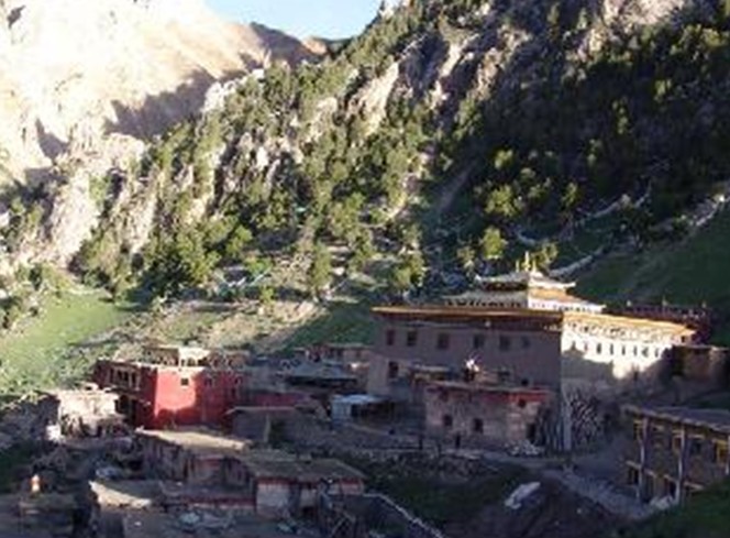 海拔4300m的達那寺坐西北面朝東南,1400多年悠久歷史的寺院就象坐落在一把“太師椅子”上一樣,中間一塊較平坦的草坡上坐落著古老的寺院;左右“扶手”上也有大小各異的僧舍,右邊“扶手”略高于左邊“扶手”。
