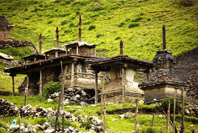 另外,在葉巴經堂的另一小殿中還供放著傳為格薩爾念誦的“帕本”經卷,寺院所在達那山西面的龍保山,山頂群石林立,上有傳為格薩爾及其部將的墓葬塔,均為噶丹派塔形,上鑄各色藏文字,惜因風化雨淋,巖羊舔蹭,字跡已難辨認。一些塔內,有大小不等的泥制塑像,一般4種,最大者白色,次為淺紅,再次為深紅,最小者為黑色。泥像上均印有近似六字真言的梵文字。