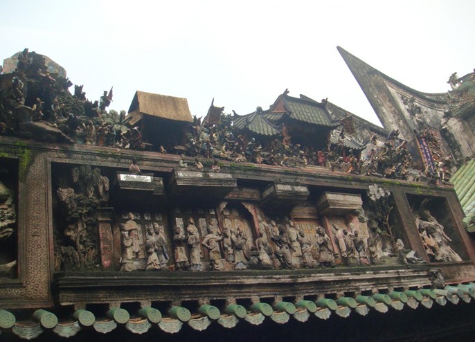 祖廟由三座廟宇并列而成,武當廟(也稱北帝廟)作為主體廟居中,左為普陀廟(也稱觀音廟),右為文昌廟(也稱文昌閣),三廟分別供奉著北方真武玄天上帝、觀世音菩薩、文昌帝君的神像。三廟的建筑均為二進院落式布局,采用磚木結構。墻體全是水磨青磚對縫砌就,屋面為碧綠色的琉璃瓦,出檐施以木雕蓮花托,四角翹飛,屋脊上鑲有雙龍戲珠及瓷制人物,栩栩如生,"藝術裙"上刻有歷史典故、神話傳說、人物花卉、詩書字畫。祖廟現存的磚雕、陶塑、石刻、灰塑等,以其工藝精湛、造型獨特、色彩斑斕,展現出祖輩們的聰明才智和濃厚的民族特色,使這座古老的廟宇真正成為巧奪天工的藝術殿堂,讓人賞心悅目,流連忘返。