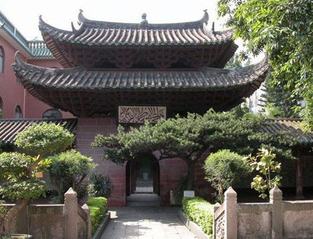 懷圣寺又名獅子寺,俗稱光塔寺,是中國四大古代清真寺之一,也是我國現存最古老的清真寺建筑。位于越秀區光塔路56號,被列為廣東省省級重點文物保護單位。唐、來以來,廣州為我國海外貿易的主要港口,那時廣州的阿拉伯富商最多,他們在當地政府的支持下,修建了一座規德宏大的清真寺,即今日的懷圣寺,寺的命名表達了中外教民對圣人穆罕默德的尊從和懷念。該寺禮拜大殿置于院庭的正面,它是3間帶周圍廊、歇山重檐綠琉璃,帶斗拱的古典式建筑,巍然聳立在帶雕石欄桿的大平臺上,充分顯示了大殿的高貴威嚴、石欄桿板上的雕刻各異,有葫蘆、扇子、傘蓋、花卉、獅子、游魚等物,極為活潑生動。大殿內部潔白明亮,用木地板及三面拉門,殿內裝飾雖少,但很整潔大方。