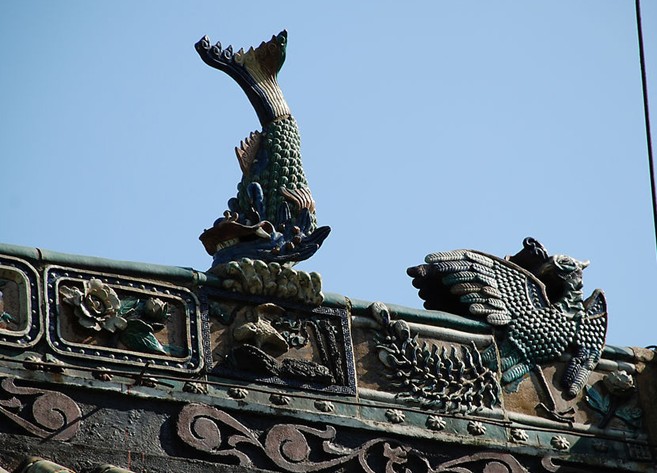 大殿是南海神廟的第四進。它是仿明代木結構琉璃瓦歇山頂建筑。屋頂用綠色的琉璃瓦覆蓋;中間有雙鳳飛翔、鰲魚倒懸等紋飾的琉璃瓦脊;上部有兩條軀體彎曲作騰飛疾走狀的蒼龍造型,它正在爭奪當中的寶珠。據說,雙鳳代表美麗,整魚代表自由,蒼龍代表權力,而寶珠代表智慧。