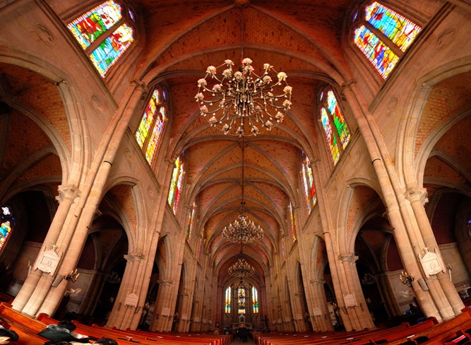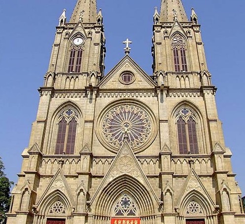 該教堂正面是一對(duì)高聳的尖頂石塔,象征升向天堂,皈依天主;石塔中間西側(cè)是一座大時(shí)鐘,石塔中間東側(cè)是一座大鐘樓,裝有四具從法國(guó)運(yùn)來的大銅鐘;西邊鐘樓的西、南、北三個(gè)塔面安裝有羅馬字鐘面的時(shí)鐘,東邊鐘樓內(nèi)懸掛著以圣母瑪利亞命名的銅鐘組;正立面的鐘樓上聳立尖塔,是哥特式教堂建筑風(fēng)格的特征,也是建筑造型藝術(shù)魅力的內(nèi)是尖形肋骨高叉的拱形穹窿;正面大門上面和四周墻壁分布的花窗欞,都是合掌式,所有門窗都以法國(guó)制造的較深的紅、黃、藍(lán)、綠等七彩玻璃鑲嵌。這玻璃可避免室外強(qiáng)光射入,使室內(nèi)光線終年保持著柔和,形成慈祥、肅穆的宗教氣氛。充分展現(xiàn):尖塔為空心的八角形錐體,用石塊砌成,其下是三層樓房,尖塔越往上越陡峭,最后像錐尖刺向蒼穹。