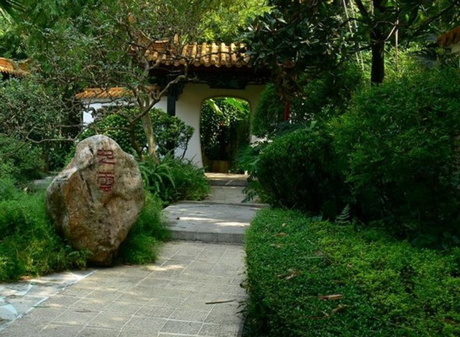由于園址不大,若敞露公園界墻,就暴露了公園的狹小空間。為了化有限為無限,采用茂林修竹,適當地補以回廊阻隔,把公園界墻全部隱藏。再通過園內綠叢與園外行道樹的互相交融在一起,把游人視線引向無限遠的地方,達到小園變成無限景域。——擴大園林空間。