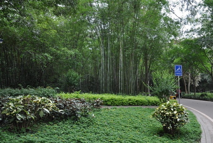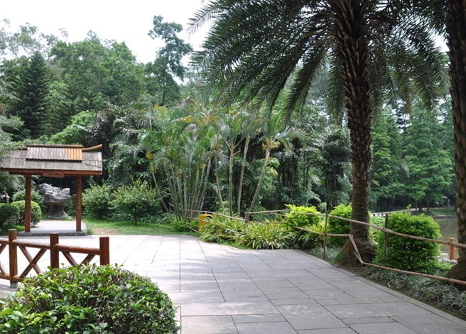 公園環(huán)境舒適,草坪舒展,山丘起伏,林木蒼翠,湖波粼粼,好一派自然清新的郊野風(fēng)情。氣勢宏偉的南北大門景色,門前廣場橫跨寬度達(dá) 100 米,建筑風(fēng)格獨特,植物色彩配置艷麗,布置緊湊,頗有現(xiàn)代公園氣派。最為壯觀的南門中軸廣場,兩側(cè)種植風(fēng)景林,配置各類棕櫚植物,襯托著中央的立體八角花壇,更加洋溢著嶺南園林的氣息。
