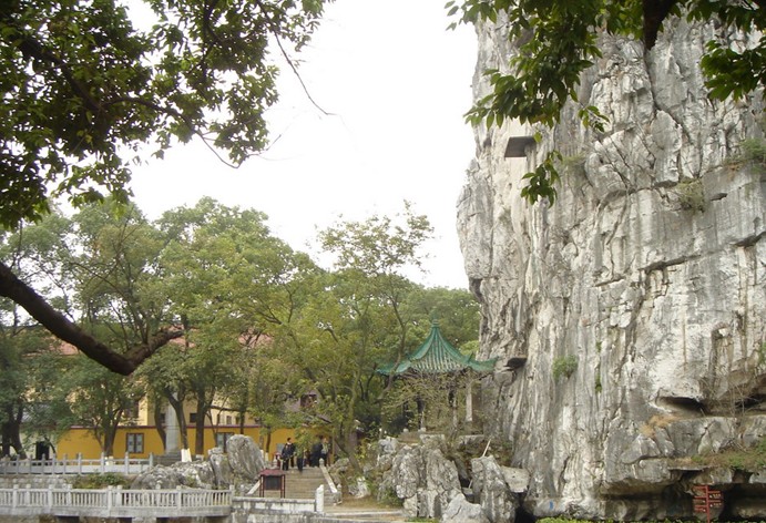 位于市中心以靖江王城內(nèi), 孤峰突起, 陡峭高峻, 氣勢(shì)雄偉, 素有“南天一柱”之稱。山東麓有南朝劉宋時(shí)文學(xué)家顏延元讀書巖, 為桂林最古老的名人勝跡。顏曾寫下“未若獨(dú)秀者, 峨峨郛吧間”的佳句, 獨(dú)秀峰因此得名。假當(dāng)晨曦輝映或晚霞夕照, 孤峰似披紫袍金衣, 故又名紫舍山。