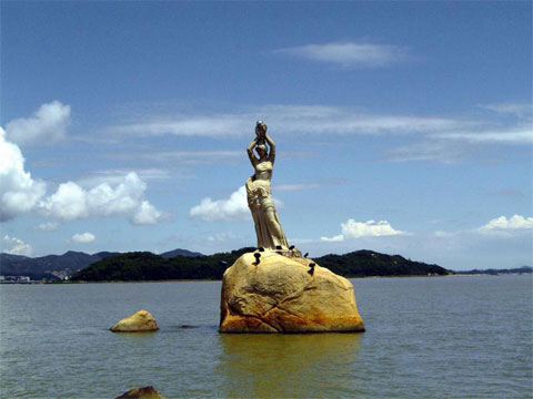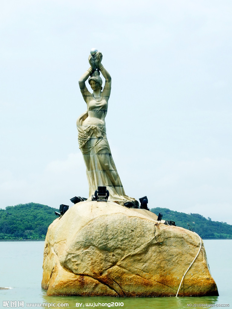 珠海市風景秀麗的香爐灣畔,矗立著一尊巨型石雕——珠海漁女,一條美麗整潔的環(huán)海大道——情侶路從她身旁穿過,更使她顯得純潔而大方。她領(lǐng)戴項珠,身掮魚網(wǎng),褲腳輕挽,帶著喜悅而又含羞的神情雙手高高擎舉著一顆晶瑩璀璨的珍珠,獻給德高望重的九洲長老,并向世界昭示著光明,向人類奉獻珍寶。