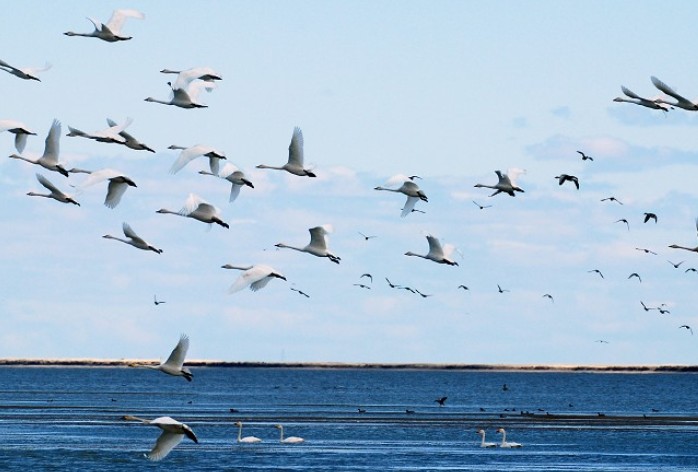 這里湖水清清,水草繁茂,蘆葦蓊郁,一望無際,猶如一條綠色的緞帶,平鋪在呼倫、貝爾兩湖中間。這個(gè)綠色的世界象塊巨大的磁場,吸引著眾多鳥類在春天從我國南方、東南亞飛臨這絕妙的世外桃源安家落戶,生兒育女。