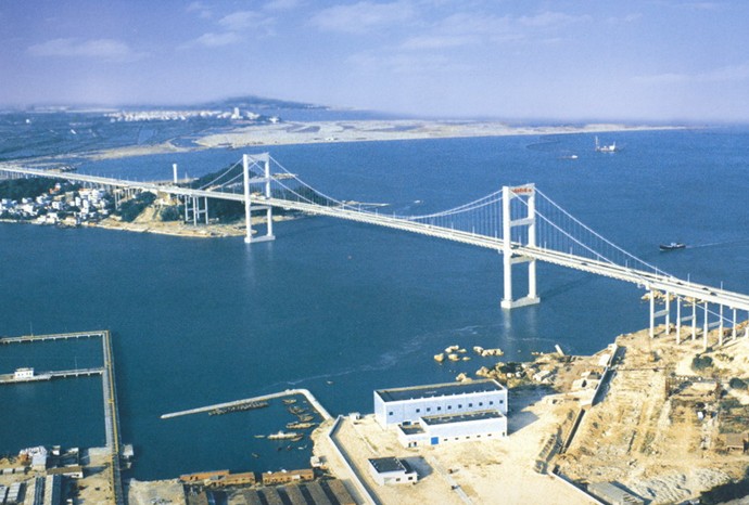 位于汕頭港東部出入口媽嶼島海域處,為跨海公路橋。橋面跨越礐石海, 全長2500米。由3部分組成:南面是跨黃沙灣南航道的預應力鋼筋混凝土加大橋勁梁懸索橋;北面是跨北航道的預應力鋼筋混凝土梁式橋;中部為橫跨媽嶼島上的預應力高架旱橋。橋主孔通航凈跨度452米,通航凈高46米,可以通過5萬噸級船舶。這座大橋是深汕兩地一級汽車專用公路的配套設施,是連結深圳、珠海、汕頭、廈門等4個經濟特區的陸地交通紐帶。