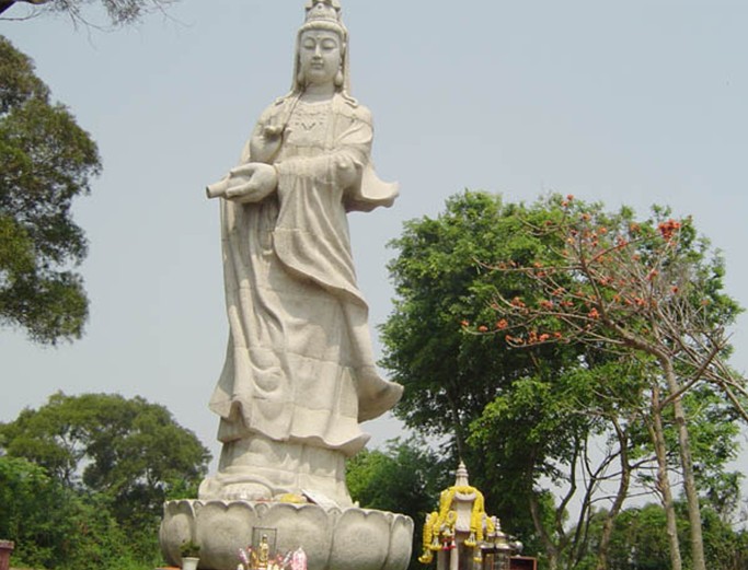 它落成于1994年5月29日,雕藝高超,面容端莊,惟妙惟肖,其左手拿甘露瓶,瓶口向下;右手執(zhí)柳枝,拈露灑人間,形象動人。這座高達(dá)12米(含蓮座2米),由總重10多萬公斤108塊石雕砌成,當(dāng)時是由市工藝美校設(shè)計,惠安縣石雕高手刻后遠(yuǎn)途載來。其左豎一石燈。又有冊形石板刻著詩僧定持所書二詩,韻妙墨妍。