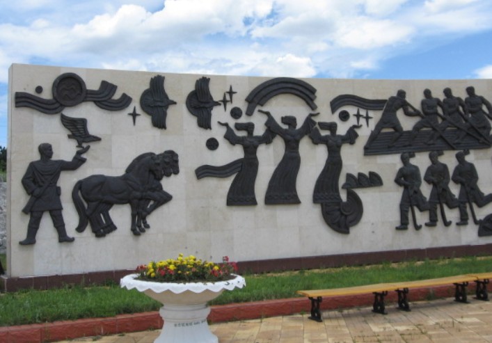 民族園東邊有一個半徑45米的圓形休閑廣場,廣場中央矗立著高大的民族圖騰圓柱,柱身四周塑有達(dá)斡爾族曾崇拜的原始圖騰物和人們生產(chǎn)、生活的歷史場景,畫面精美、歷史感強、民族特色鮮明。柱頂有一只雄鷹(海東青)昂首振翅,搏擊長空,意寓勤勞、勇猛、智慧的達(dá)斡爾族及莫力達(dá)瓦人在向著美好的未來奮力騰飛。環(huán)繞圖騰柱的是反映達(dá)斡爾歷史上生產(chǎn)生活中使用的大輪車、弓箭、搖籃、神鼓等器物和人們飼養(yǎng)的羊、狗等。廣場上兩面達(dá)斡爾族歷史文化墻,藝術(shù)地再現(xiàn)了達(dá)斡爾族的歷史神話傳說、生產(chǎn)、生活、文體活動等場面。