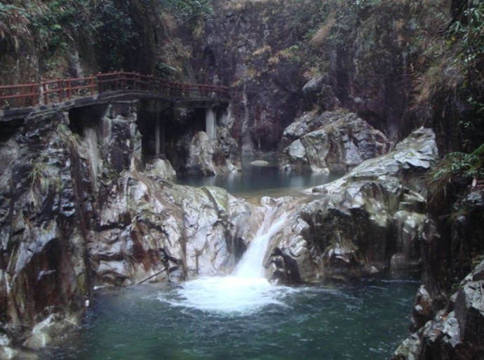 這是進入公園大門后的第一個景區。蓮池,顧名思義池中生長著睡蓮和各種各樣的蓮花,池岸婉然曲折,“荷花出淤不生塵,蓮葉如蓬睡美人。水榭瑤臺多雅韻,拱橋望月夜來新。”是蓮池映月的最好的寫照。徒步往大門后左側山坡沿小徑向上攀登,進入一片以木蘭科樹木組成的香花林。一路上花香陣陣,使人陶醉。靜坐林中小亭,體味一種遠離塵囂的感覺,便覺得不枉此行。香花林下山腳一片平緩山坡是森林燒烤場,遙遙聽見潺潺水聲,聞聲溯源,原來是蓮池之水源頭。一簾瀑布從天而降,飛珠濺玉,名為鵑山響水,有詩云:兩峽溝深坡峭陡,龍潭瀑布響潺潺。鵑花開放紅如血,杜宇啼痕月一彎。在這一景區還設有山泉游泳池,水涼而鮮,是夏天游客望而心動的所在。