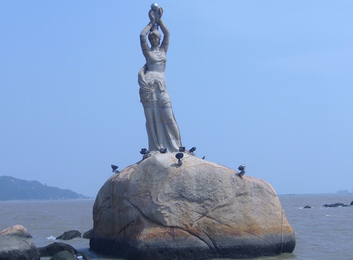 珠海市風景秀麗的香爐灣畔,矗立著一尊巨型石雕——珠海漁女,一條美麗整潔的環海大道——情侶路從她身旁穿過,更使她顯得純潔而大方。她領戴項珠,身掮魚網,褲腳輕挽,帶著喜悅而又含羞的神情雙手高高擎舉著一顆晶瑩璀璨的珍珠,獻給德高望重的九洲長老,并向世界昭示著光明,向人類奉獻珍寶。