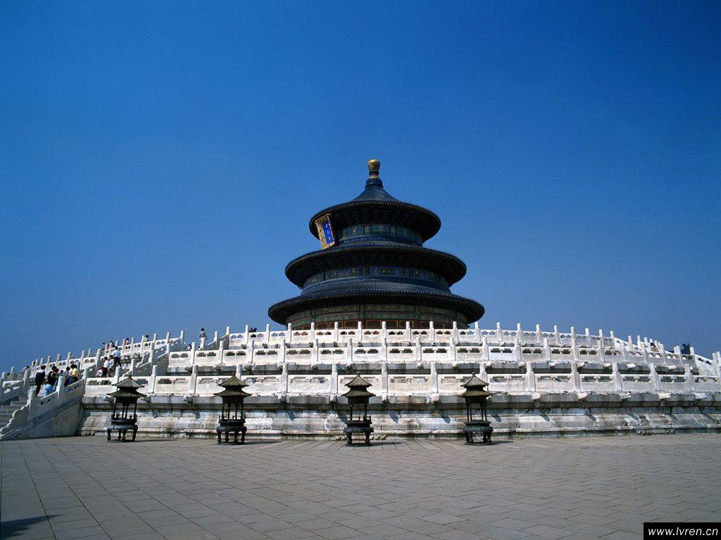 在整個北京城里,北有地壇祭地,南有天壇祭天,東有日壇祭太陽,西有月壇祭月亮,其中天壇最為光彩奪目、氣宇非凡。天壇始建于明永樂十八年(1420年),清乾隆、光緒時曾重修改建。為明、清兩代帝王祭祀皇天、祈五谷豐登之場所。天壇是圜丘、祈谷兩壇的總稱,有壇墻兩重,形成內外壇,壇墻南方北圓,象征天圓地方。主要建筑在內壇,圜丘壇在南、祈谷壇在北,二壇同在一條南北軸線上,中間有墻相隔。圜丘壇內主要建筑有圜丘壇、皇穹宇等等,祈谷壇內主要建筑有祈年殿、皇乾殿、祈年門等。著名的祈年殿在最北方,這是天壇內最宏偉、最華麗的建筑,也是想象中離天最近的地方。祈年殿的上下三層屋頂,均用深蘭色琉璃瓦鋪蓋,象征天色。