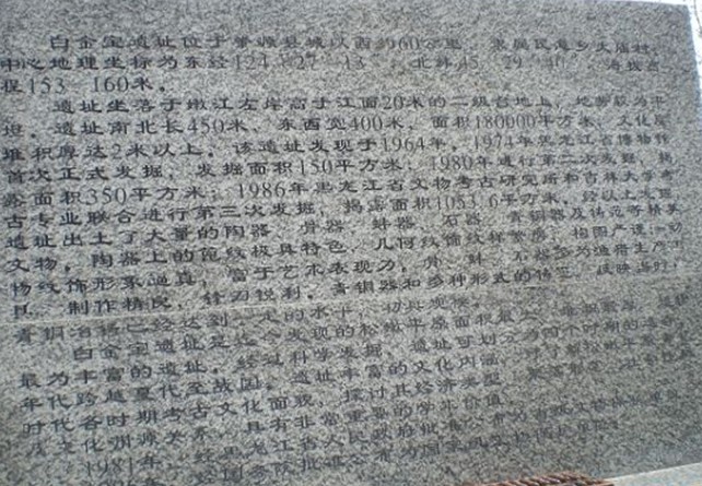 白金寶遺址位于肇源縣民意鄉(xiāng)嫩江左岸的白金寶屯。白金寶屯的南側(cè)是寬闊的嫩江河床灘地,北側(cè)是嫩江左岸的二級(jí)階地。階地面高出嫩江水面約30米,西北較高,向東南漸趨平緩,那上面豎起了一方標(biāo)志石碑,版權(quán)所有山東聊城聊之旅國(guó)際旅行社有限公司,轉(zhuǎn)載必究!這里是白金寶遺址的核心地帶。
