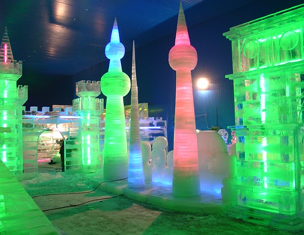 現(xiàn)代獨特的冰質(zhì)造型藝術(shù)與冰景造園藝術(shù),是冰城人開發(fā)利用冰雪資源最為突出的成就之一。它以松花江天然冰、自來水和各種電燈為材料,用砌筑、堆壘、雕刻、噴澆、冷凍和鑲嵌等方法,根據(jù)特定的主題需要和總體布局安排,在不同的園林空間加工出有關(guān)的冰景,冰建筑、冰雕塑、冰 瀑布、冰花壇、冰滑梯、冰書法、冰盆景、冰廣告、冰凍花、冰罩燈,組成若高低錯落、疏密有致的不同景區(qū),形成步步有景、步移景易的冰雪園林,同時配置各種燈光,增加動的成份,輔以音響效果,達到形、光、動、聲的和諧統(tǒng)一。冰燈藝術(shù)是以冰為載體,以燈為靈魂,融繪畫、雕塑、建筑、園林、文學、音樂等多種藝術(shù)于一身,并可運用光學、力學、聲學及電氣、機械等科學技術(shù)的新興的造型藝術(shù)。運用這種藝術(shù)形式創(chuàng)造出的珠宮琳館、瓊榭瑤橋、銀雕玉塑、冰山雪嶺、冰凌冰瀑,白晝間千姿百態(tài),晶瑩剔透,入夜后流光溢彩,萬紫千紅,象撲逆迷離的仙山瓊閣,似如夢如幻的水晶宮闕,且年年出新意,歲歲景不同,被稱為"永不重復(fù)的童話世界"。冰雕,即是冰燈中的一個品種,又是一種獨立的藝術(shù)形式。哈爾濱每屆冰雪節(jié)期間,都要分別組織職工、家庭、少年兒童和全國中學生以及國際性的冰雕比賽,比賽產(chǎn)生的數(shù)百件作品姿態(tài)各異,生動傳神,巧奪天工。