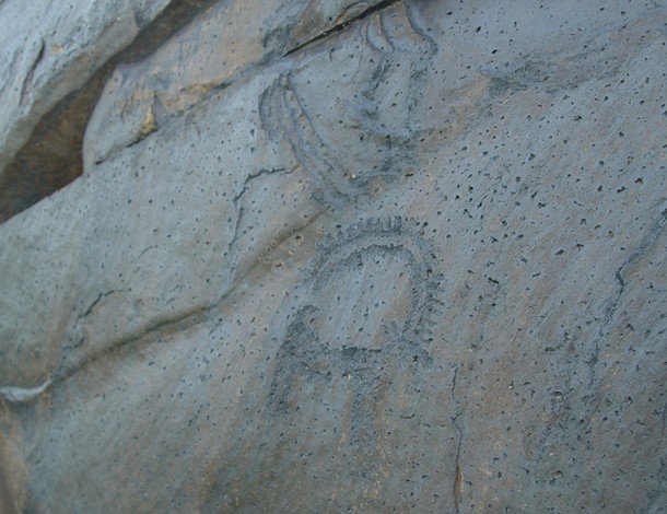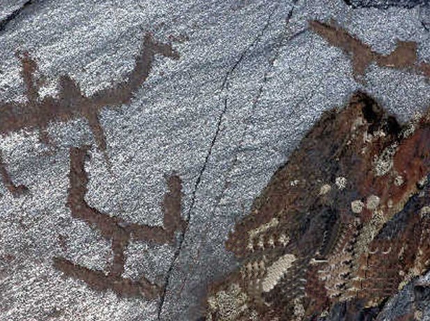 畫馬崖巖畫群中的巖畫,是用極其簡單的線條勾勒出的各種造型,類似于現(xiàn)代繪畫中的速寫風格,但是其線條卻異常簡潔甚至抽象,寥寥數(shù)筆卻惟妙惟肖。以現(xiàn)代人的認知對這些圖案進行解讀,簡單線條勾畫出的圖案可能是馬、人和太陽,還有一些魚、虎、龍、狗、仙鶴等等。然而,專家考察卻發(fā)現(xiàn),巖畫中描述人的線條頭型呈不規(guī)則的圓隆狀,四肢和身體都用形狀不同的線條表示。