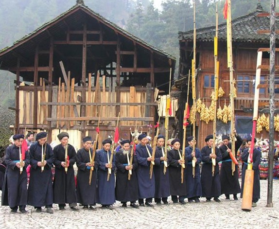 貴客進郎德上寨得按苗家禮俗喝攔路酒。從寨腳公路開始,到寨頭的進寨門樓,設迎客攔路酒卡,多達12道。每道酒卡,在路中間放一張方桌,兩邊站著幾個身著盛裝的苗族男女青年,提壺端杯,向客人敬酒,每道兩土碗,表示福壽雙全。最后一道酒卡是進寨門樓,土碗換成了大牛角。如此一路想滿飲進寨者,非“海量”莫能。不過不善飲酒的客人也不必擔心,只要你雙手背在身后,彎腰用唇輕觸酒杯即離,并有禮貌他說一聲“兜社莫”(苗語“謝謝你”)就可以“過關”了。主人雖然好客,但絕不會強人所難。歡迎儀式還有燃鐵炮、放鞭炮、奏莽筒、唱酒歌等。在這之后,婦女們身穿繡衣條裙,頭戴銀角冠,男子們則長袍馬褂,全村盡出,把客人引至寨中心蘆簽場。場上銅鼓高懸,青年鄉民在這里為客人獻上傳統的苗族歌舞:蘆笙舞、板凳舞、木鼓舞,銅鼓舞……最后,全村男女老少絡繹上場,圍成若干個同心圓,隨著銅鼓點子款款繞場起舞,客人們也被邀入場內,使狂歡活動達到高潮。歌舞之后,可信步走人普通苗家,那“吱呀”的紡車,“嚓嚓”的布機,講述著大山中寧靜的生活,熱情的村民定會邀你在吃新節或過苗年時再來,那是他們最隆重的節日。