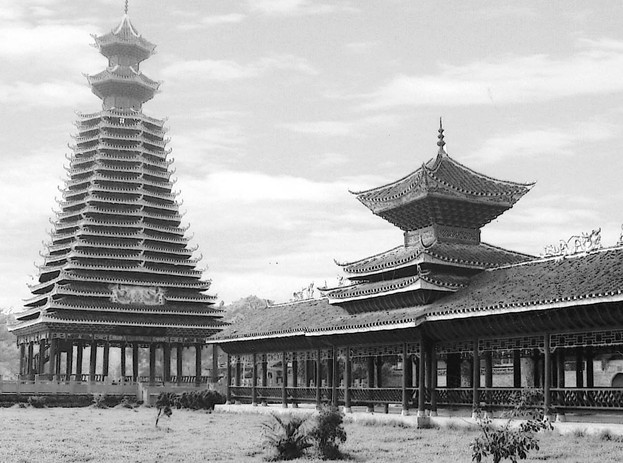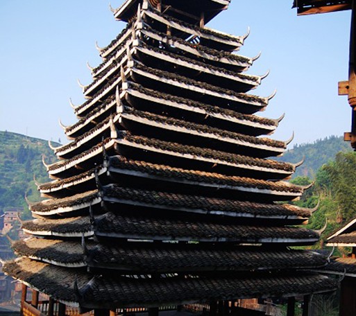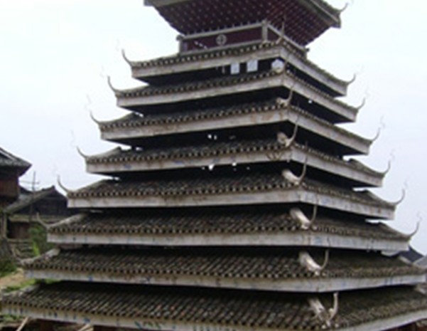 苗族鼓樓在臺江縣城東南方20公里的排羊鄉(xiāng)九擺村上寨中間,樓旁古木參天,蒼翠綠郁。 鼓樓為三重檐歇山頂屋面,木結(jié)構(gòu)建筑,覆蓋小青瓦,其 下層呈平面四方形,空間寬敞。樓高11米,占地52平方米,整 個(gè)建筑結(jié)構(gòu)以中間獨(dú)柱為中心,周圍16根外環(huán)檐柱為襯。利用 逐層內(nèi)收的粱、枋、瓜柱、檐柱支撐挑出屋檐。結(jié)構(gòu)無一釘一 鉚,攆橫穿斜插,銜接緊密牢固。前后留進(jìn)出通道。