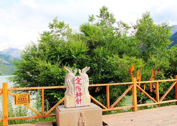 定海神針是天池周圍方圓幾公里內唯一的一棵榆樹,也是海拔最高的一棵樹。在天池湖岸邊有一棵郁郁蔥蔥,枝繁葉茂,傲然獨立的大榆樹,這就是天池八景之一的“定海神針”。神話傳說:相傳當年王母娘娘開蟠桃盛會,廣邀各路神仙,唯獨忘了邀請瑤池水怪。席間水怪興風作浪,王母娘娘怒不可遏,拔下頭上的一枚碧玉簪,擲入水中降服水怪。