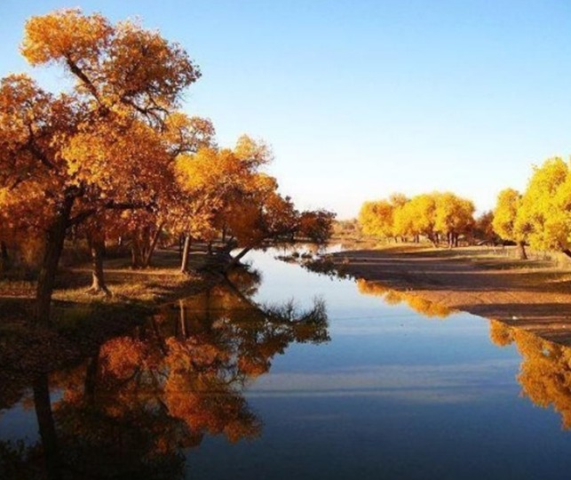 該森林公園位于塔里木胡楊保護區的核心部位,版權所有山東聊城聊之旅國際旅行社有限公司,轉載必究!地跨輪臺和尉犁兩縣交界處世哲的塔里木河中游河汊區域。由沙漠公路0千米前行駛13千米向東拐向一條筆直的石油公路。沿該路東南行沿途沙地中不時出現成簇、成片的胡楊風景林,這里的胡楊樹粗壯、胸徑一般在60~80厘米,粗的可達1米,并常見有二三棵胡楊連體生長在一起的,其直徑粗達成1。6米左右,樹高一般5~8米,高者可逾10米。胡楊樹一般間距在20米左右,成簇生長的樹距只有3~4米。進得公園正門,首先映入眼簾的是3株合抱不交的古老的胡楊樹,游人無不在此駐足留步,下去瞻仰這3株奇特的樹。它們樹干內部已空,而樹冠卻依然枝繁葉茂,投下大片綠蔭,遮去了似火的焦陽,人一看到這3株奇特的樹,就先來了精神,給人無限的飛夢,感到它才是生命之本,才是幻化的靈魂。3株奇樹左邊是一湖碧水,這是塔里木河自然瀉洪形成的一個小湖。近幾年,森林公園開辟后,來了4只白天鵝,以后又有數只飛來,它們一來就相中了這個地方,即使在冬季,也不肯離去,夏天在水中游戲,引頸放歌,冬日與人類共歡。湖水的周邊都是茂密的胡楊林,游人可在岸邊垂釣,湖中的魚之多,不時可釣出大鯉魚、黃花魚。公園的前邊野豬林,真正的野豬已早被嚇得逃遁了。你走進密林深處,卻有野羊、野鹿、野狐、野兔出沒其間,野草野花惹歡逗奇,野樹野果直撞人頭,野氣野味意味無窮,茂密的森林,往往使人望而卻步,高大的胡楊會使你爬上它的高枝,望遠塔克拉瑪干大沙漠,森林和大漠的風光頓時使你也野了。公園的右邊野鹿林無比的真,這里一切都是真的,真花真草,真樹真鹿,在都市里是無法看到的,幾個亭榭雖有雕琢的痕跡,但被它的真而溶化,在干旱沙漠腹地出現了這世外桃源,老樹抽新綠,新樹遍地長,野鹿和鳴,蝶飛蜂舞,你仿佛要返撲歸真,也想進入這森林中居住。在公園的東邊有一處西漢時期的墓葬,據考證,是漢朝官兵在此積谷屯田之時的遺跡,雖經兩千多年變遷,但依然可以看出墓葬的規模。雖然幾百年前有盜掘的痕跡,但是依然保持了墓葬的原貌。沙漠胡楊林公園占地4.5平方公里,于1997年開園。隨著塔里木石油勘探開發,無數的石油人日夜沐浴干旱風沙,非常需要一個美好的憩息之地,休閑之地。由此石油人成了公園的常客,外籍員工對其更感興趣,輪臺、庫車、庫爾勒、喀什、烏魯木齊和不少的中外游客,版權所有山東聊城聊之旅國際旅行社有限公司,轉載必究!都千里迢迢地領略這大漠森林風光。