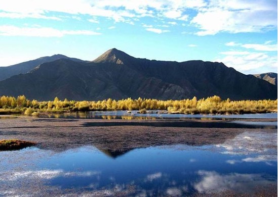 然烏湖周圍高山危聳峻峭,眾多海拔5000米以上的高峰皆有冰川發育;而山下近湖坡地則長滿了青翠蒼勁的松柏等針葉林叢,在這群山綠影環抱之中的然烏湖顯得格外靜謐而嫵媚,它那明鏡般的湖面倒映著四圍的雪峰、翠林和那藍天白云,景色異常迷人;再加上湖畔綠茵般的草灘上成群的牛羊以及一塊塊生長著青稞、豌豆、油菜等作物的農田點綴其間,構成了一幅既有青藏高原獨特的壯麗風貌、又有藏區田園牧歌般風韻的風情畫卷。當你沿著湖邊公路巡視暢游時,你就會充分領略到這里的風采,并讓你有種回歸自然的感覺,心曠神怡之極。