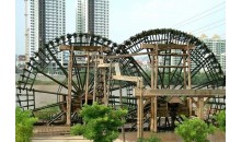 黃河水車,位于黃河河灣,距沙坡頭約6至7公里。這里聳立著6架木制巨型水車,經河水沖擊,日夜緩緩旋轉,并發出嘩嘩的巨大聲音,引起了游客的無限興趣。水車是黃河沿岸一種古老的提水灌溉工具。