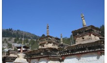 卡瑪多塔林位于類烏齊縣國道317線右側,距縣城25公里。塔林依山位傍水、風景秀麗、古木參天、蒼松翠柏、四季常青。在蔥郁翠柏中有一座別致的小經堂,主供蓮花生大師像,左右各豎有幾根高大的轉經筒。傳說,過去這兒有108個塔,現已恢復和修建的塔有幾十座。其造型各異,別具一格,既有要求嚴格的八佛塔,也有方形怪塔;既有幾米高的大塔,也有不到三米的小塔。
