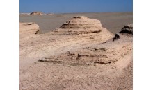 且末古城位于且末縣城西南約6公里的老車爾臣河岸臺地上,海撥款1,273米,遺址地表無植被,已沙化,呈雅丹地貌。在東西長約1公里,南北寬200米的范圍內,地表散布著大量陶片及鐵塊,煉鐵渣,曾采集到數件磨盤石殘塊,玻璃片,料珠。此外,在遺址中心區風蝕地表,尚殘存數間房屋及其他建筑遺址,1985年9月挖掘出的古代毛織品,古尸,遍地尸骨墓室,還有陶片弓箭。