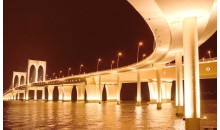西灣大橋是連接澳門半島和氹仔島的第三座大橋,于2002年10月8日動(dòng)工興建,主橋于2004年6月28日合龍。西灣大橋北起澳門半島融和門,南至氹仔碼頭,采用“豎琴斜拉式”設(shè)計(jì),兩個(gè)主橋躉之間跨度達(dá)180米。該橋總長2200米,分上下兩層:上層為雙向6車道,下層箱式結(jié)構(gòu),雙向4車道行車,可以在8級(jí)臺(tái)風(fēng)時(shí)保證正常交通,橋內(nèi)還預(yù)留了鋪設(shè)輕型鐵軌的空間。