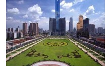 天河東站綠化廣場位于廣州市新城市軸線上,占地面積4.7萬平方米,于1998年9月中旬動工,1999年7月1日正式完成并交付使用。廣場中央綠地2.6萬平方米,鋪種馬尼拉草18315平方米,其中有6000平方米種植標志性的紋樣,分圍種植1300平方米的福建茶綠籬。中央草坪四周設有41個花池,24個柵池,24個花缽,廣場綠化率達82%。仿南越王墓制式花壇,遍植各種嶺南花卉。