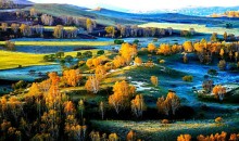 禾木草原位于布爾津縣喀納斯河與禾木河交匯區的山間斷陷盆地中,海拔1124~2300米。盆地周圍山體寬厚,頂部呈渾圓狀,河流多切割為峽谷,地形復雜,禾木河自東北向西南貫穿其間,將草原分割為兩半,山地陽坡森林茂密,蒼翠欲滴,馬鹿、旱獺、雪雞棲息其間;而陰坡綠草滿坡,繁花似錦,芳香四溢,蜜蜂在采花釀蜜,牛羊滿山遍野覓食撒歡,一派迷人的廣袤草原景色。