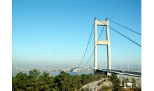 江陰長江公路大橋,位于江蘇省江陰市黃田港以東3200米的西山,主跨1385米(328+1385+295),橋塔高190米,為兩根鋼筋混凝土空心塔柱與三道橫梁組成的門式框架結構,重力式錨碇,主梁采用流線型箱梁斷面,鋼箱梁全寬36.9米,梁高3米,橋面寬29.5米,雙向六車道,兩側(cè)各設寬1.8米的風嘴,1999年建成。