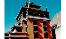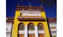 班禪新宮位于扎布倫寺以南,是十世班禪在1954年建造的夏宮,新宮建筑富麗堂皇,十分幽雅,是避暑的好地方。宮內放置了很多西藏歷史文物及藝術精品,尤以一幅《八思巴會見忽必烈》的壁畫,最為精美。新宮有三道門,第一道門前檐有四根八角朱漆大柱抵頂,門殿浮雕著兇悍不馴的野獸、騰躍欲飛的蟠龍和各種花卉圖案門壁兩側。彩繪著卷云、猛虎、長龍、人物和佛教故事壁畫。筆法細膩,形神俱肖。